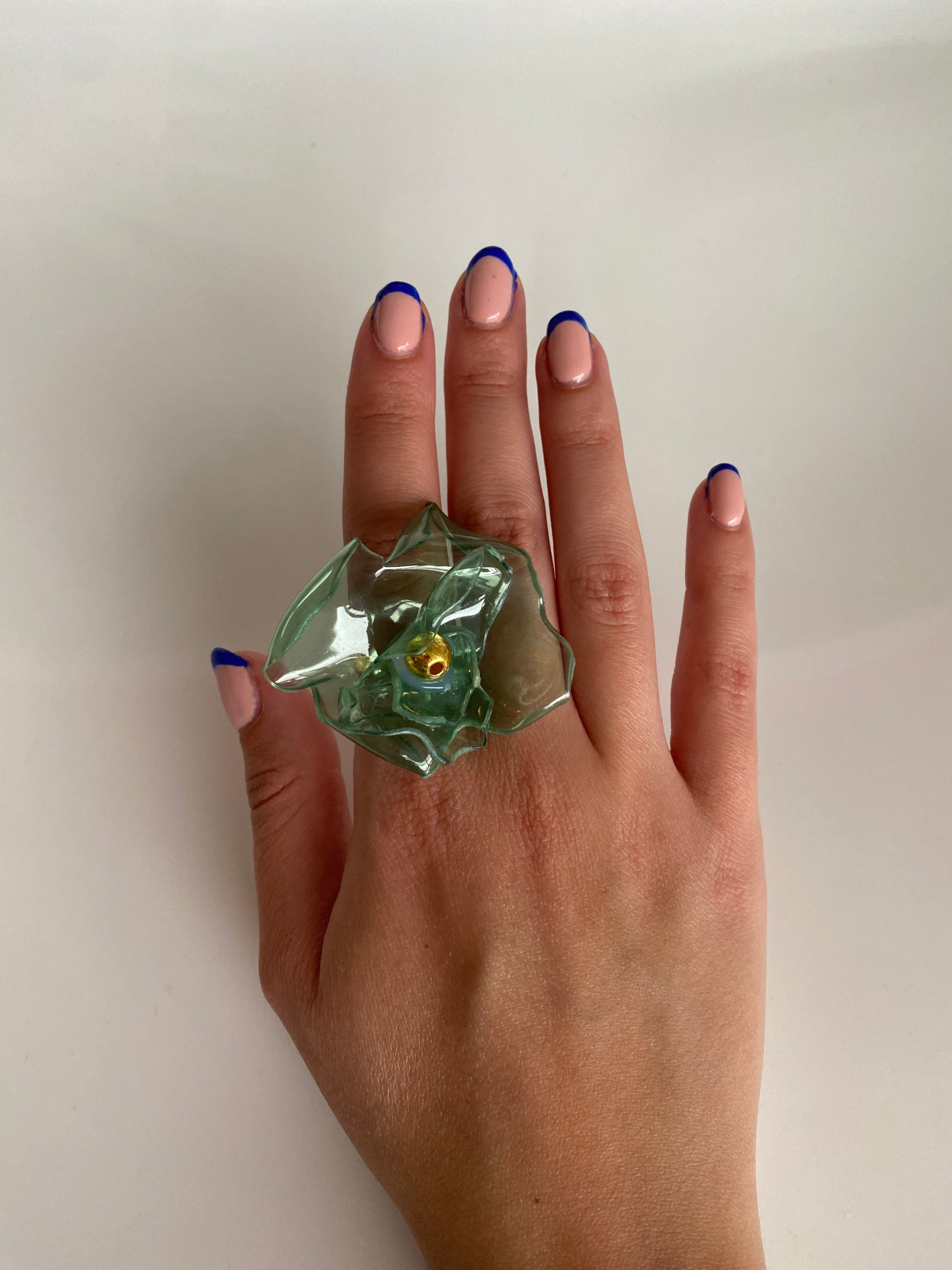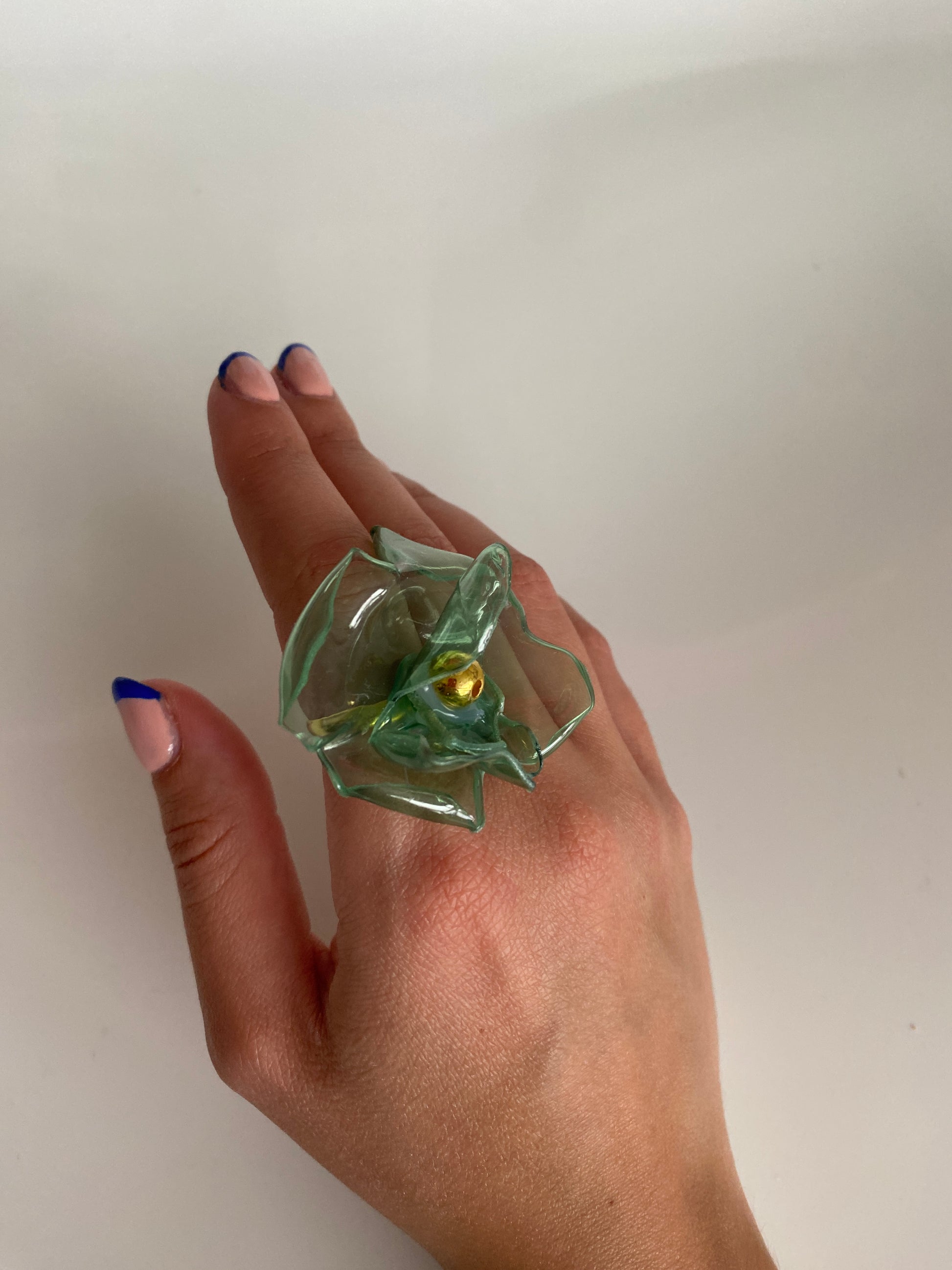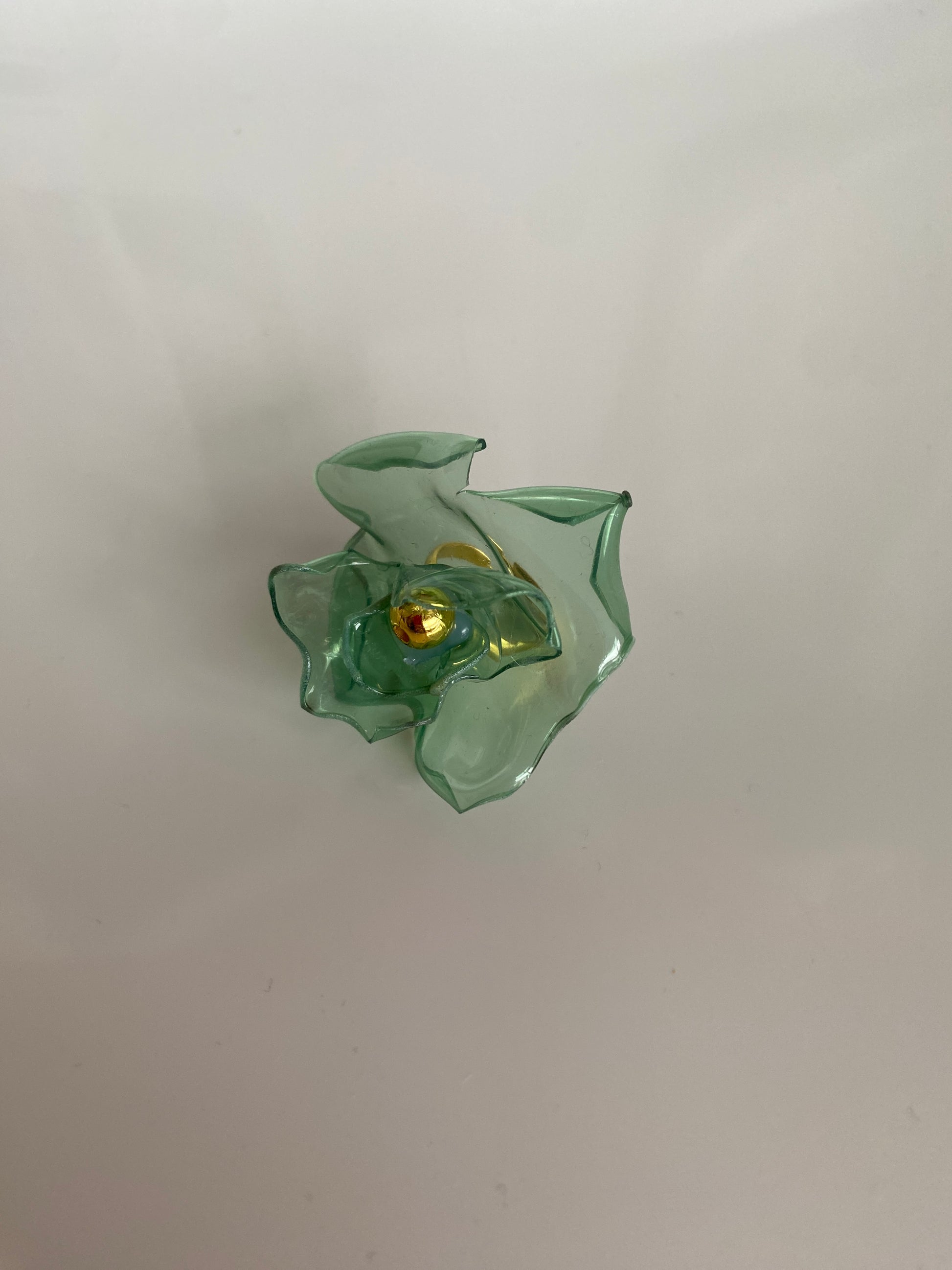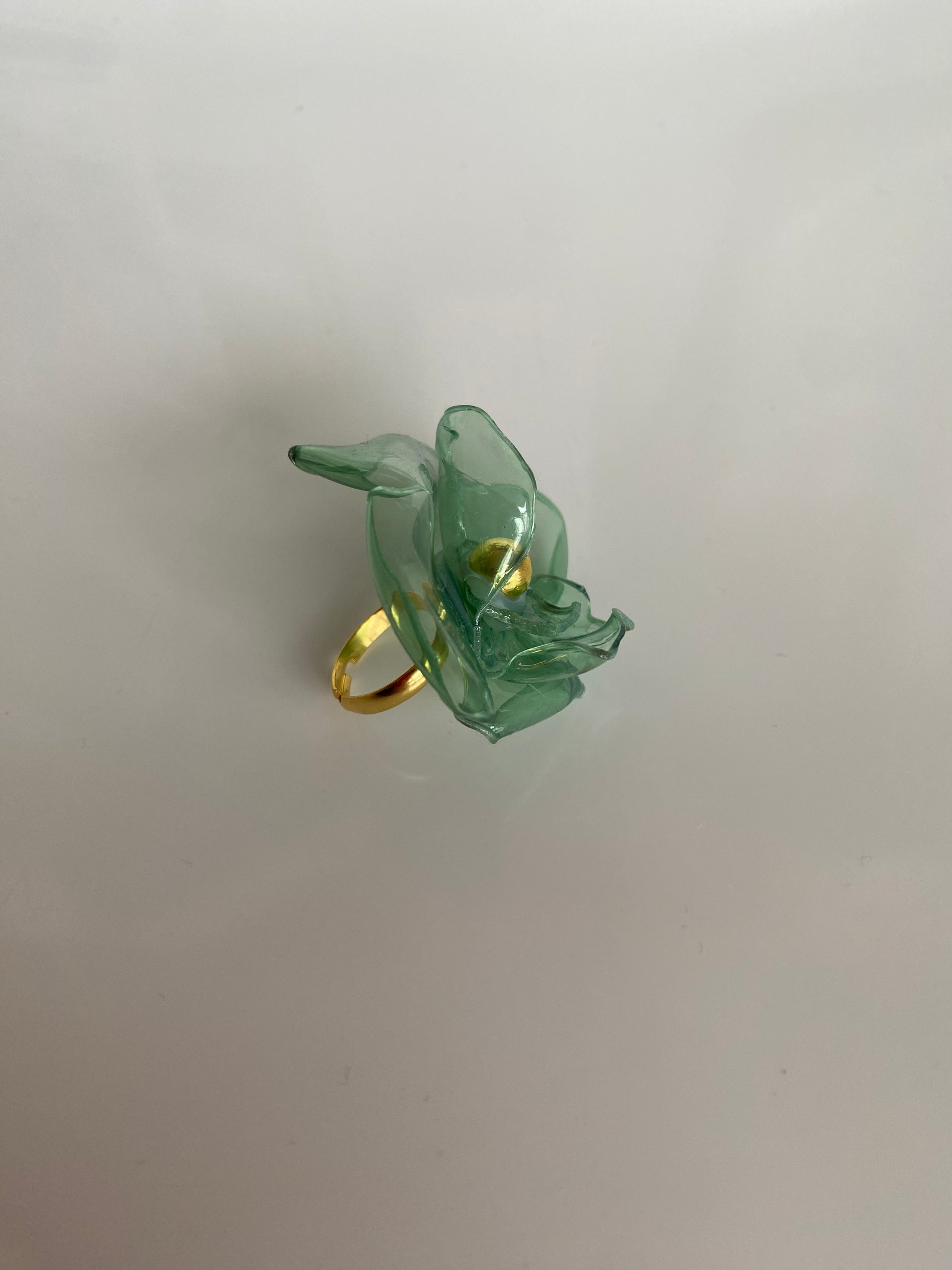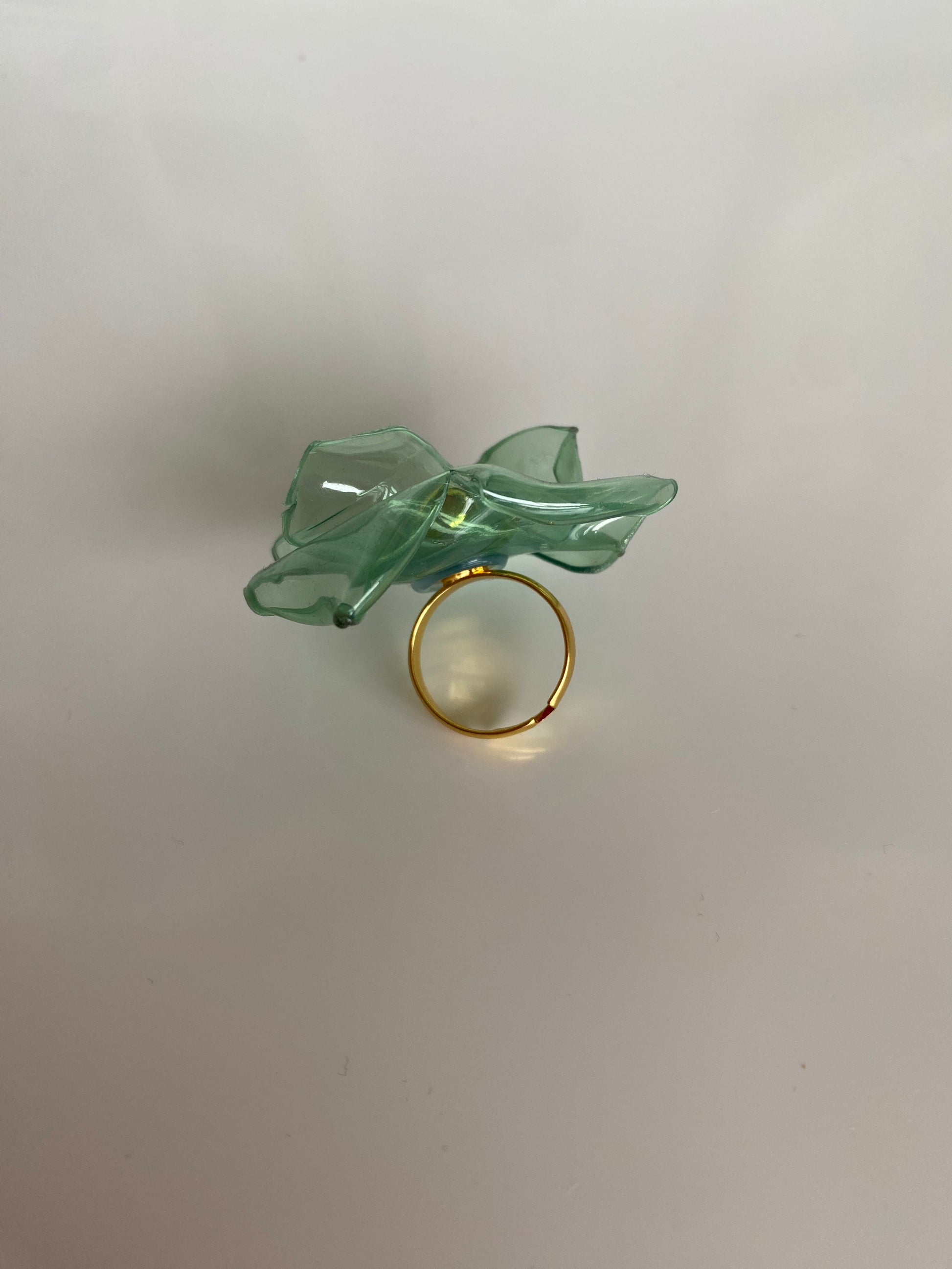 Abstract green flower ring made out of recycled plastic with multiple gold beads. The ring base is made out of stainless steel and it's adjustable to any size.