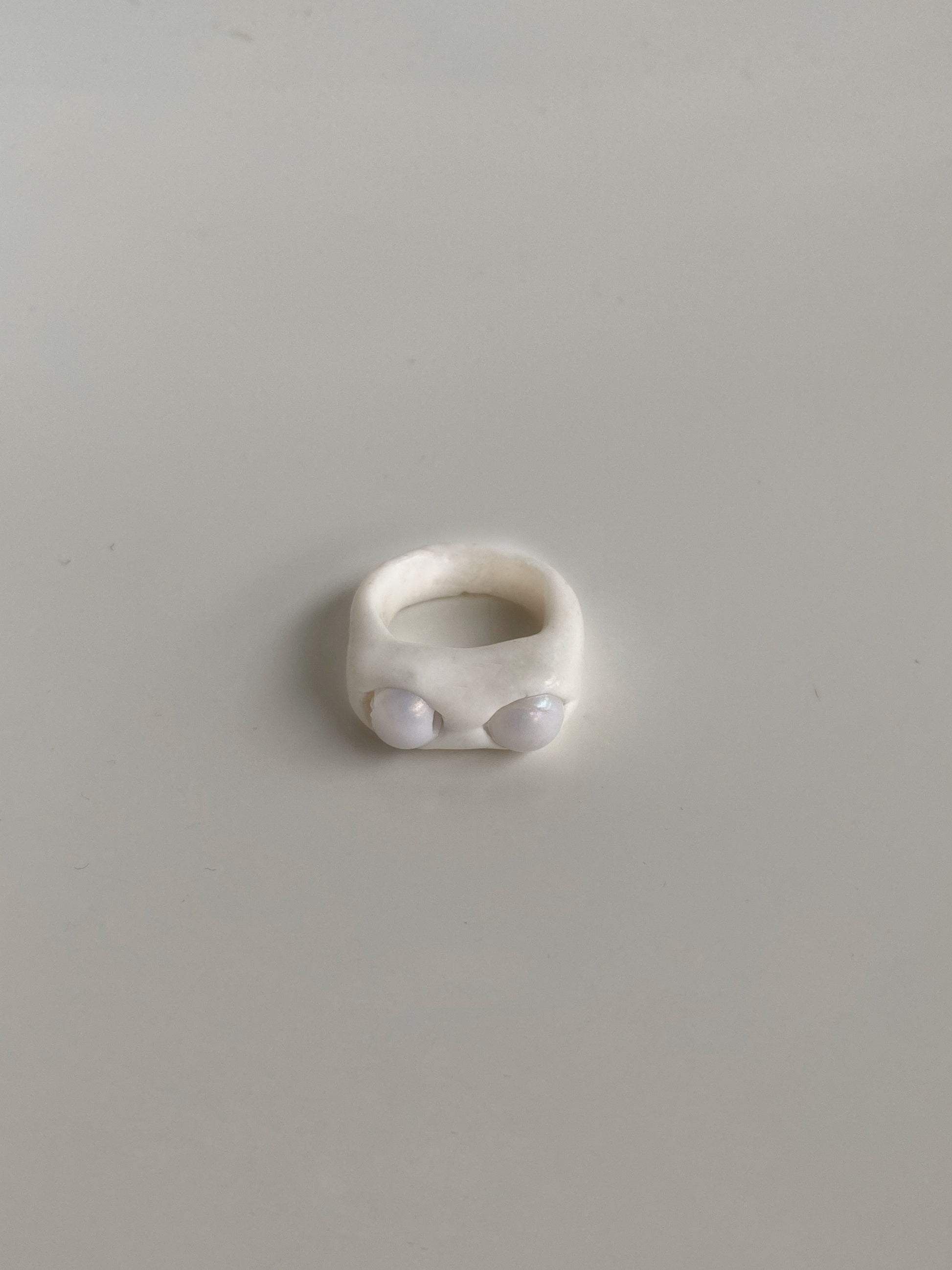 Embrace innocence and elegance with our handmade chunky clay ring, featuring a chic squared shape adorned with two lustrous pearl effect beads. Radiating sophistication and charm, this ring is a timeless accessory that effortlessly elevates any look with its refined allure.