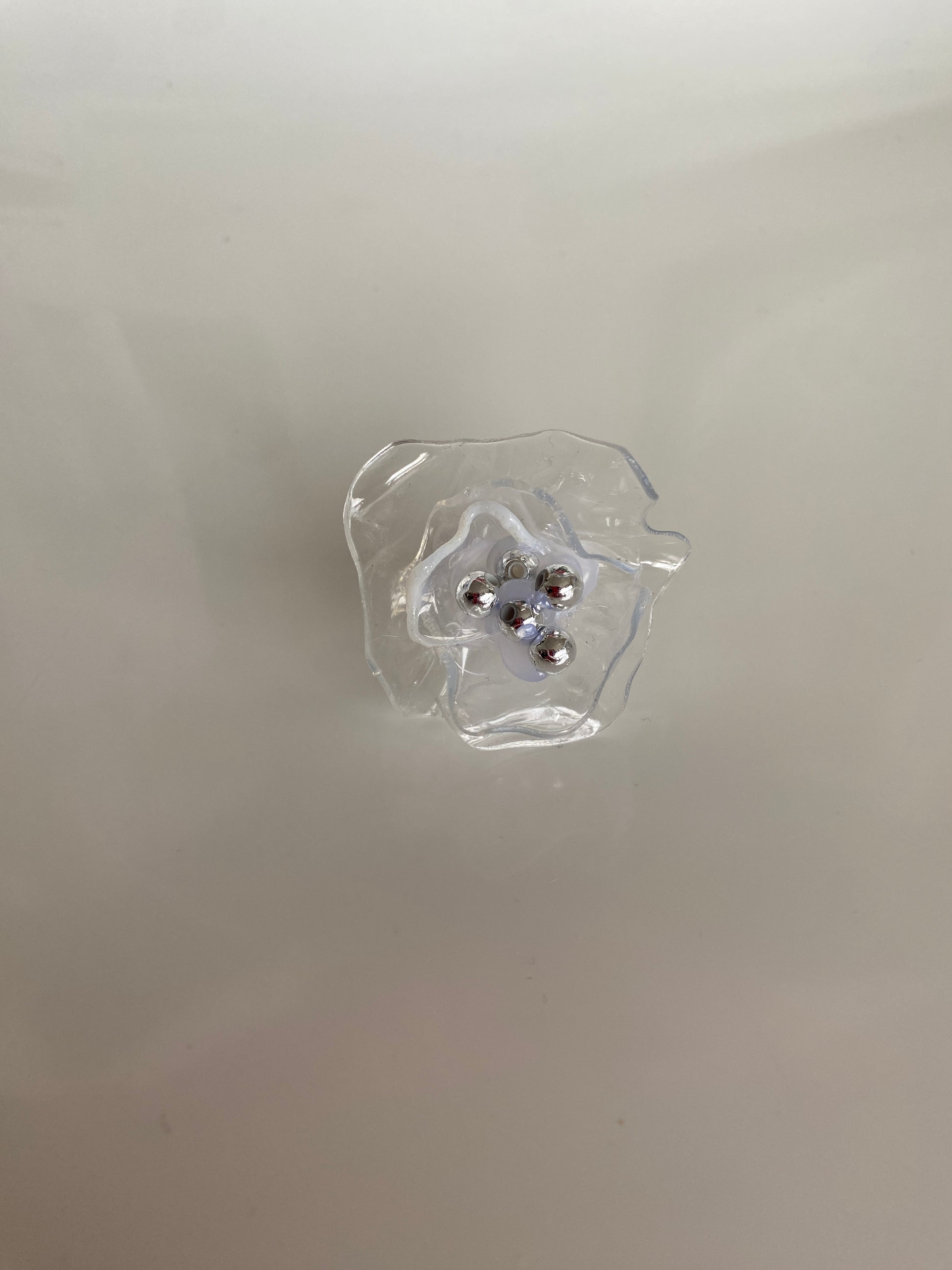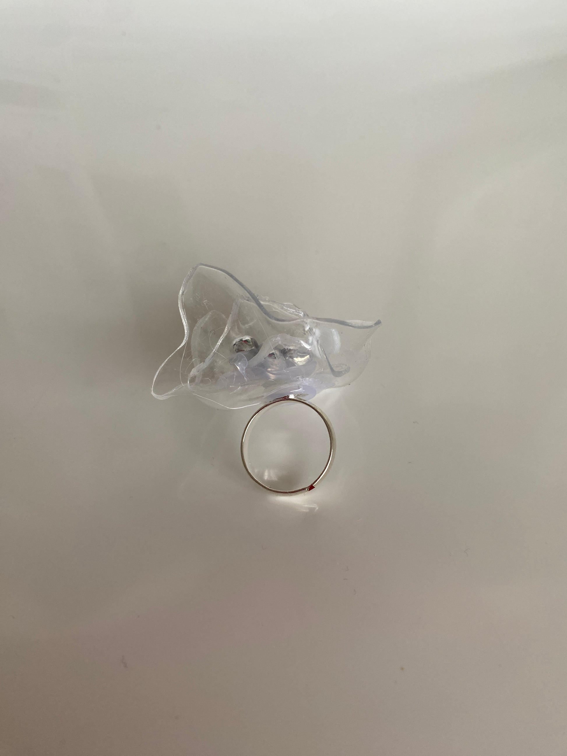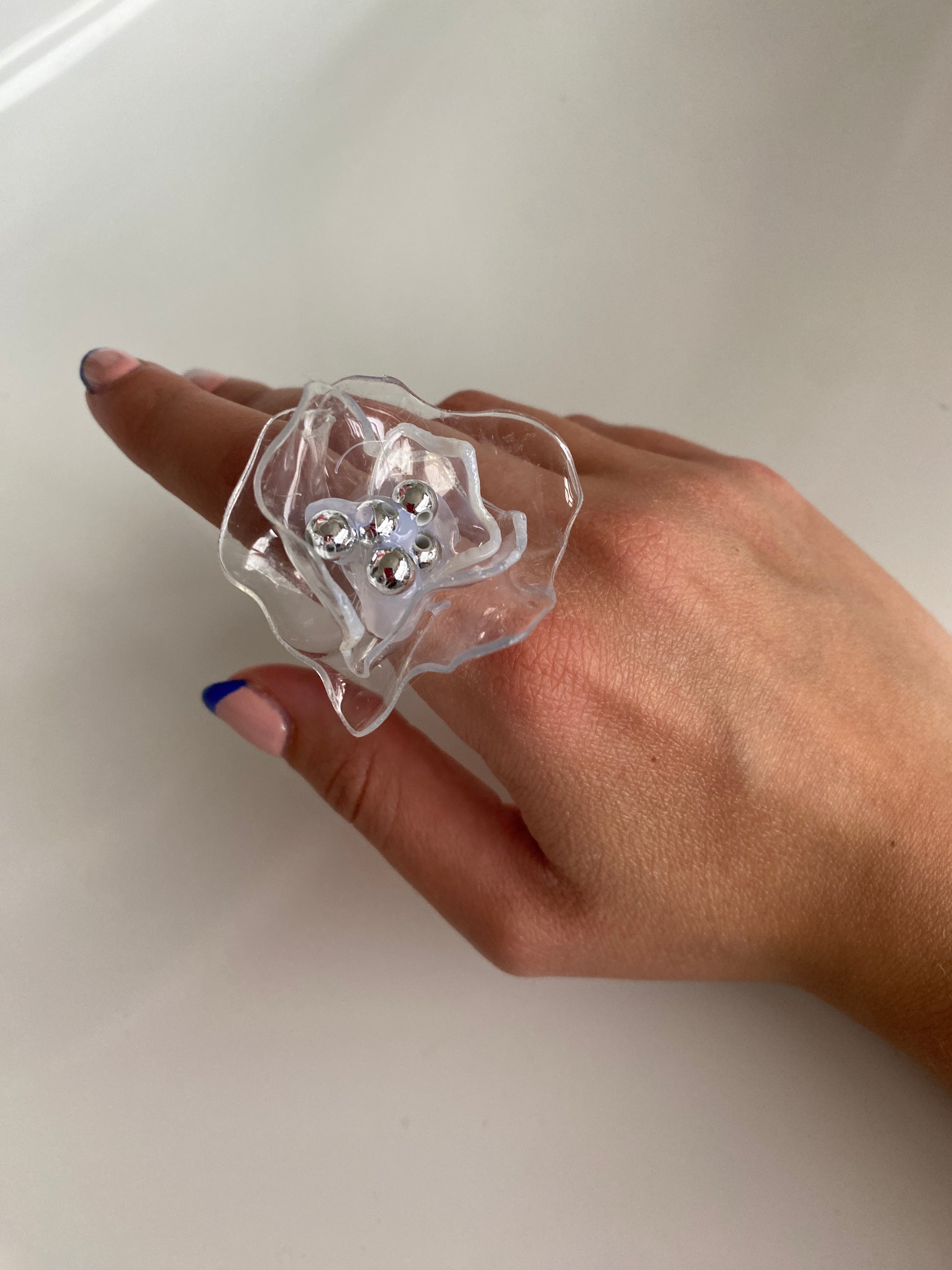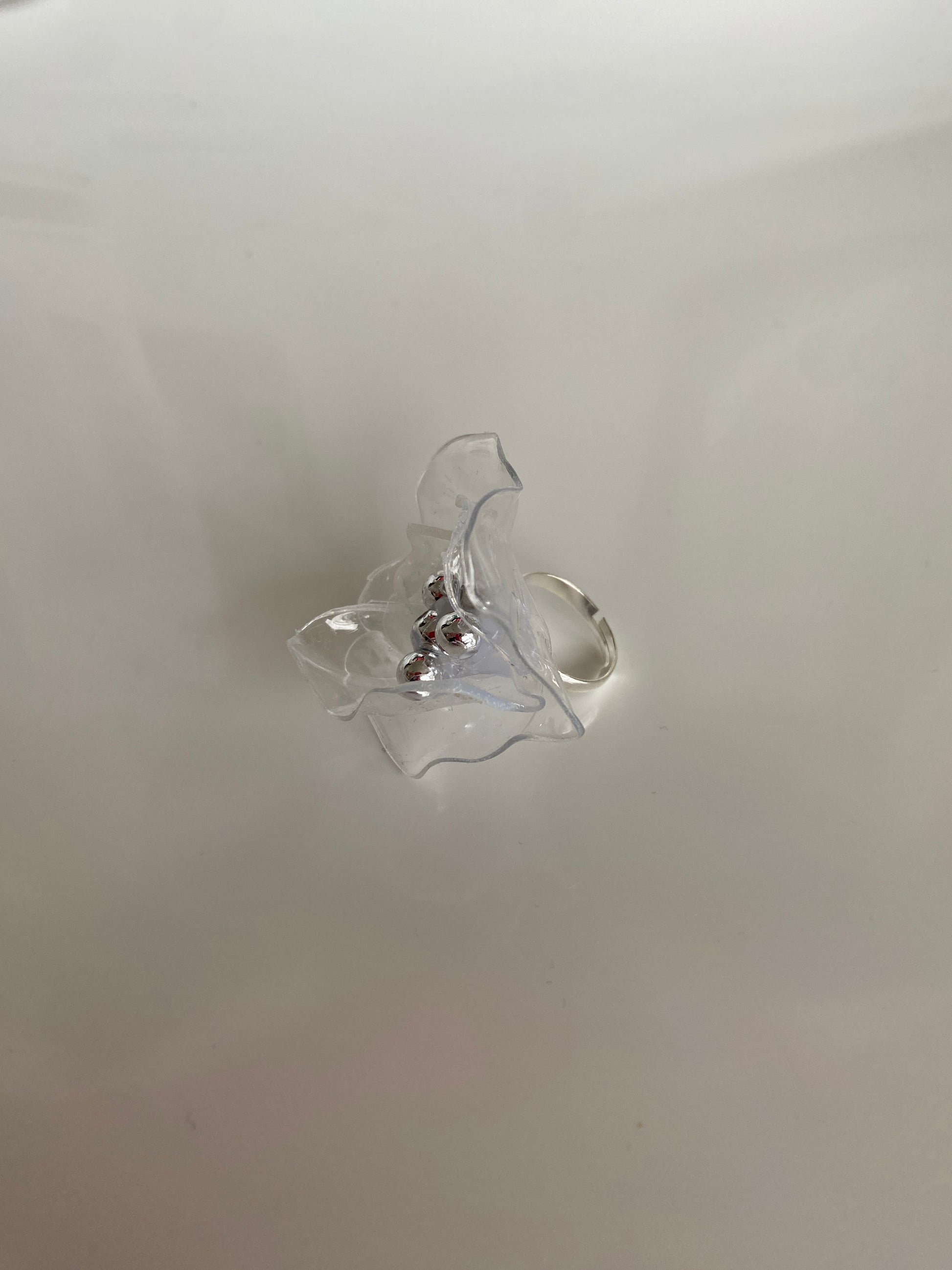 Abstract clear flower ring made out of recycled plastic with multiple silver beads. The ring base is made out of stainless steel and it's adjustable to any size.