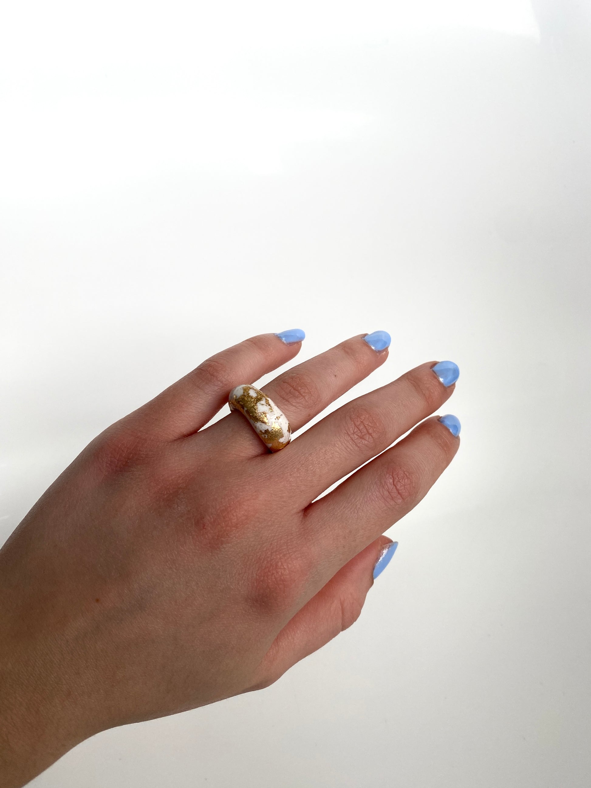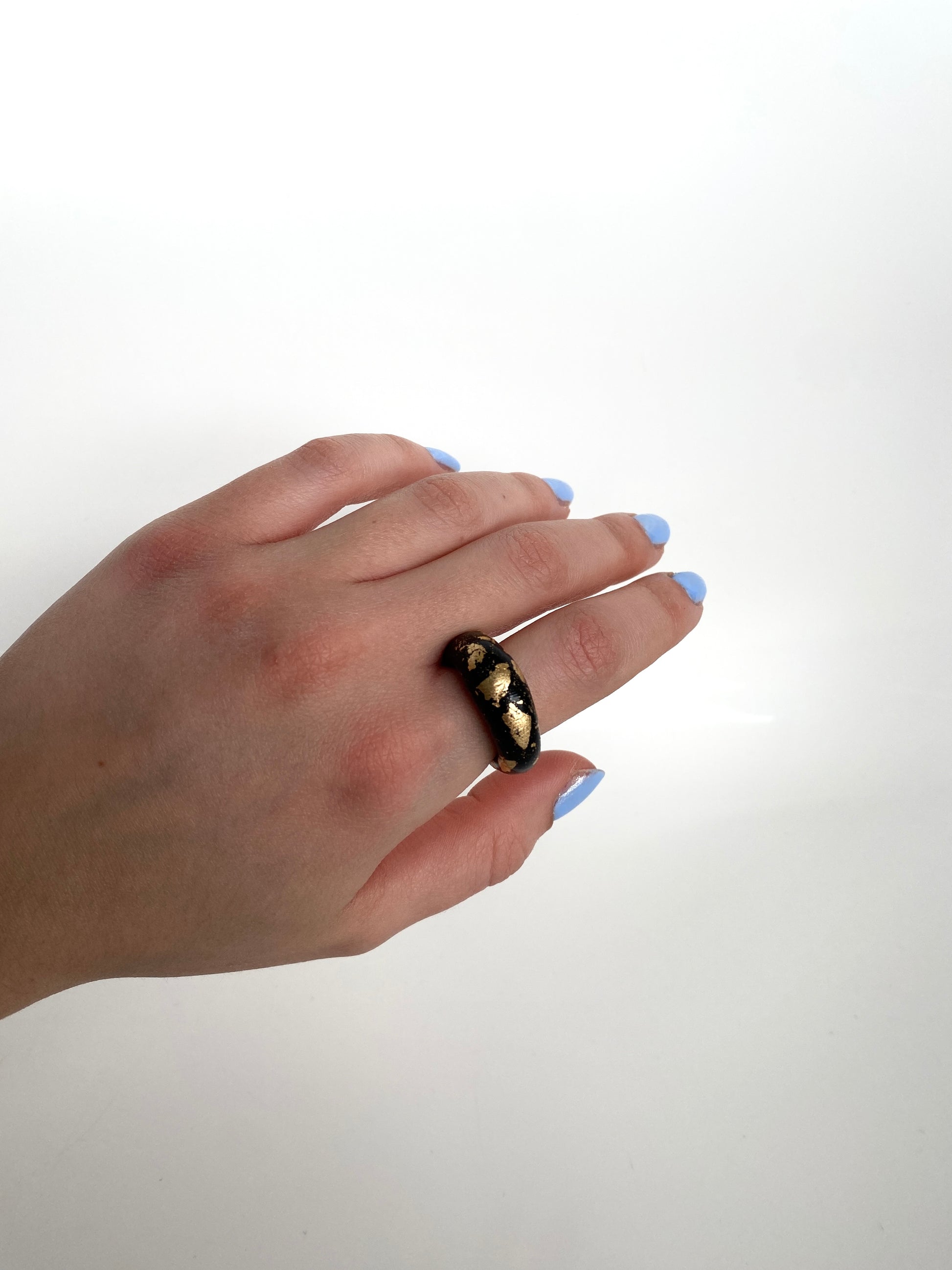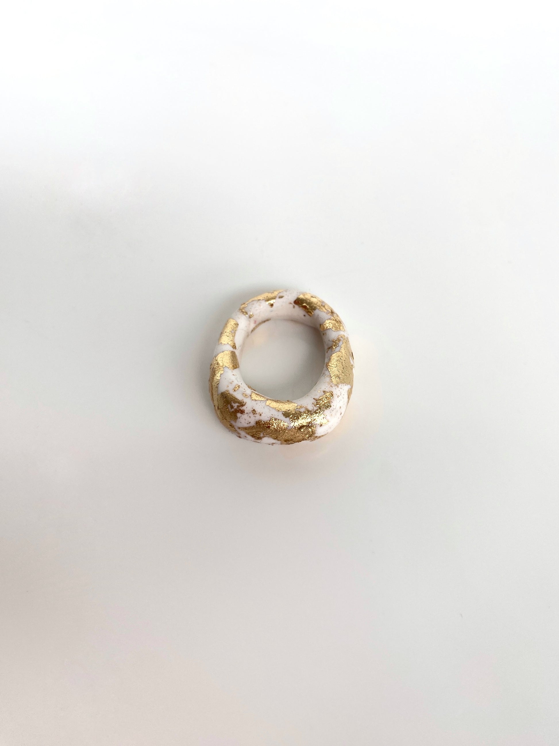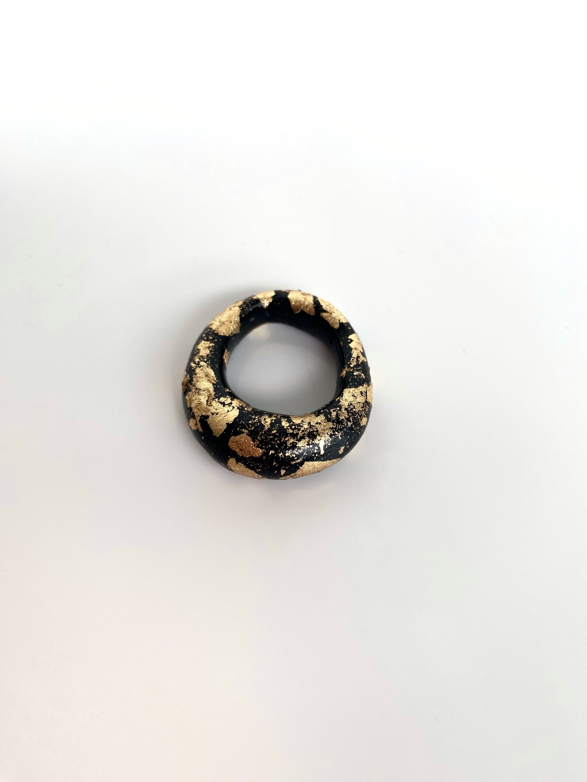 Indulge in bold sophistication with our handmade chunky clay ring, boasting a captivating round shape adorned with luxurious gold foil accents. Available in timeless black or pristine white, this statement piece exudes effortless style and versatility, promising to elevate any ensemble with its unique charm and elegance.