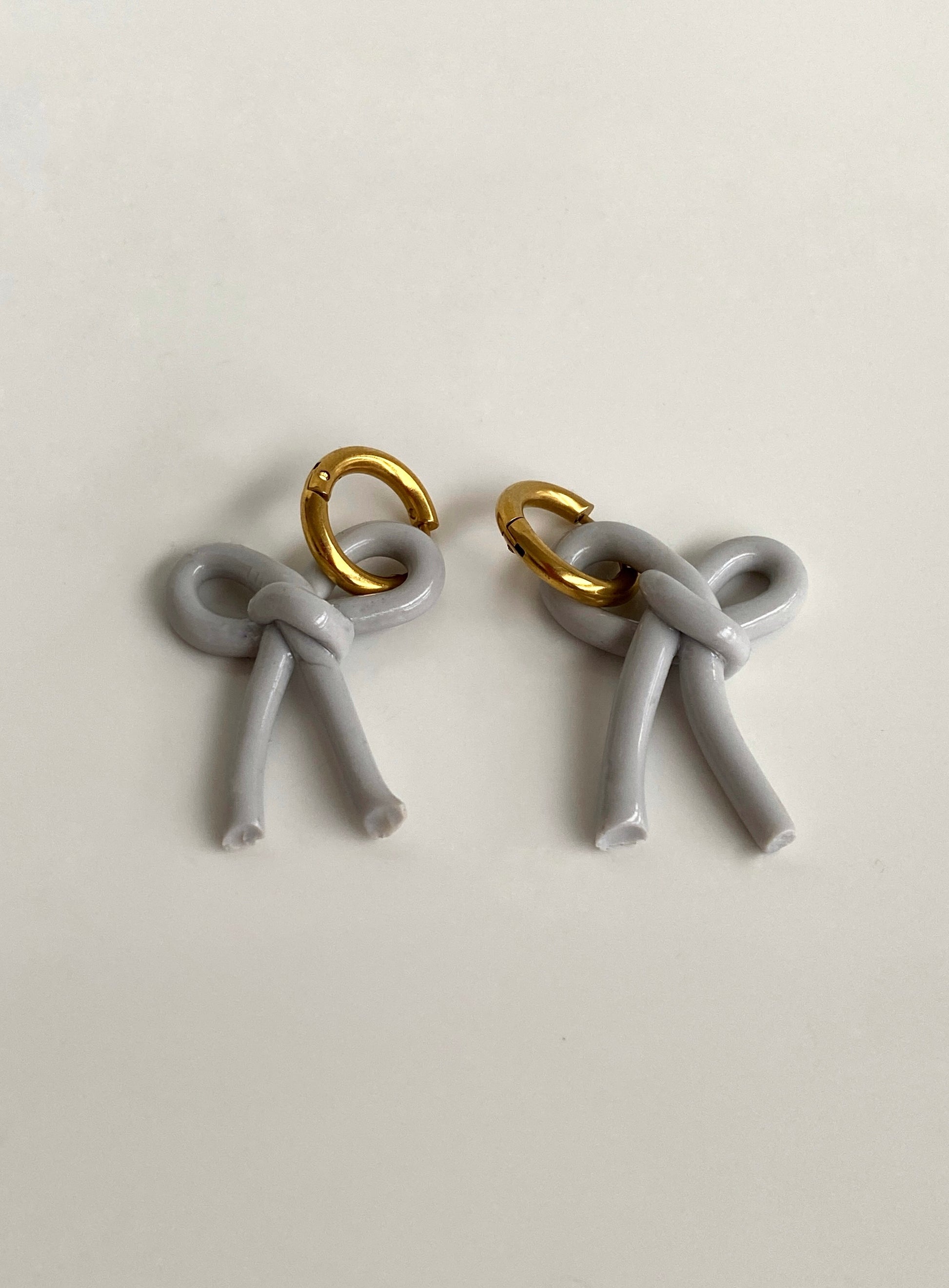 Indulge in the timeless allure of our meticulously crafted clay earrings boasting a graceful bow design, handcrafted to perfection for a touch of sophistication. Adorned in a sleek grey hue and complemented by interchangeable gold hoops, these earrings offer versatility and elegance, seamlessly transitioning from day to night with effortless charm.