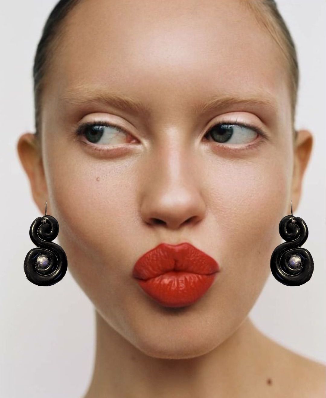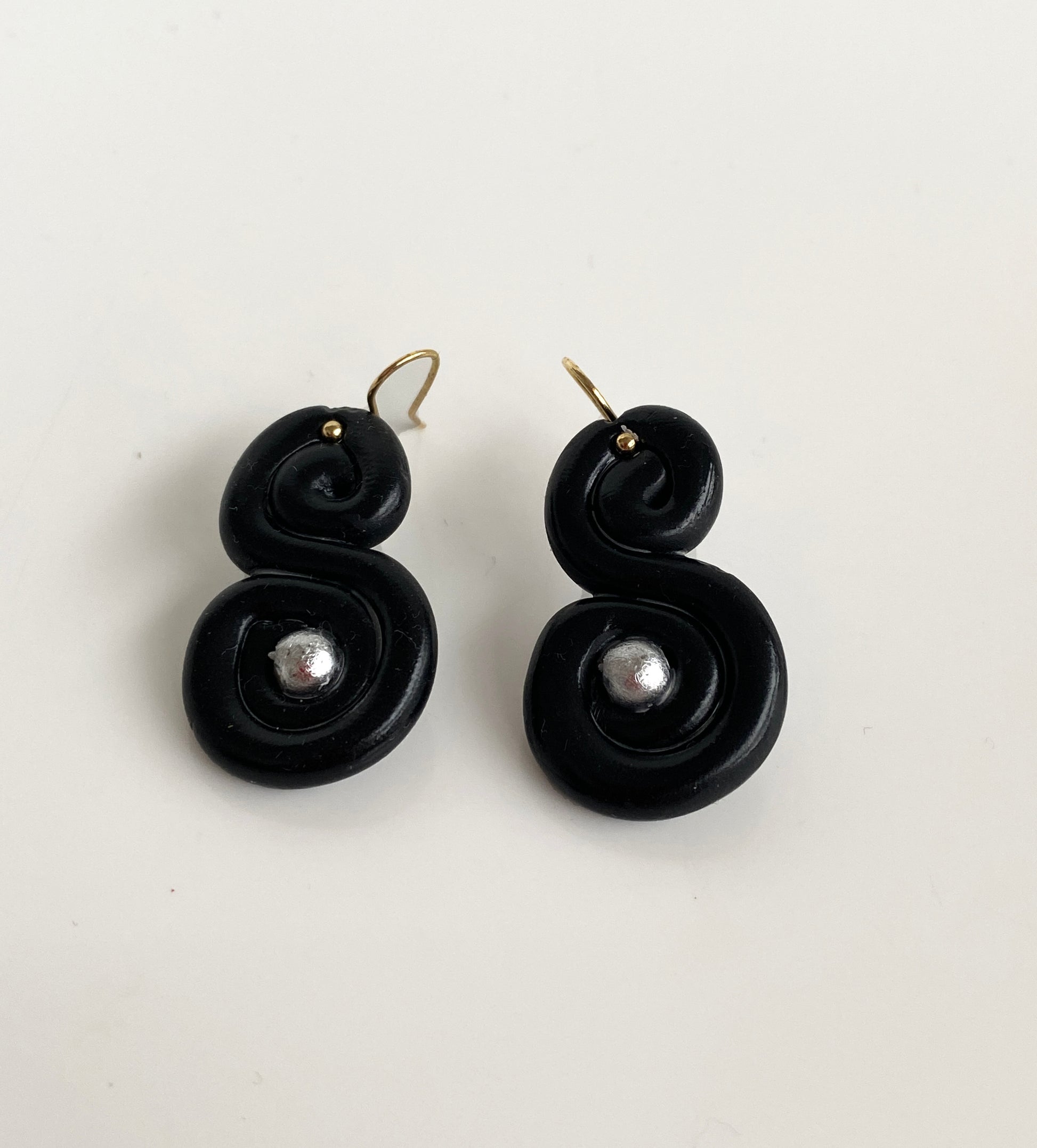 Introducing our exquisite spiral S-shaped clay earrings, meticulously handcrafted from sleek black clay and adorned with a shimmering silver bead for a touch of sophistication. Complete with versatile gold hooks for effortless customization, these earrings offer a perfect blend of modern style and timeless elegance, elevating any ensemble with understated glamour.
