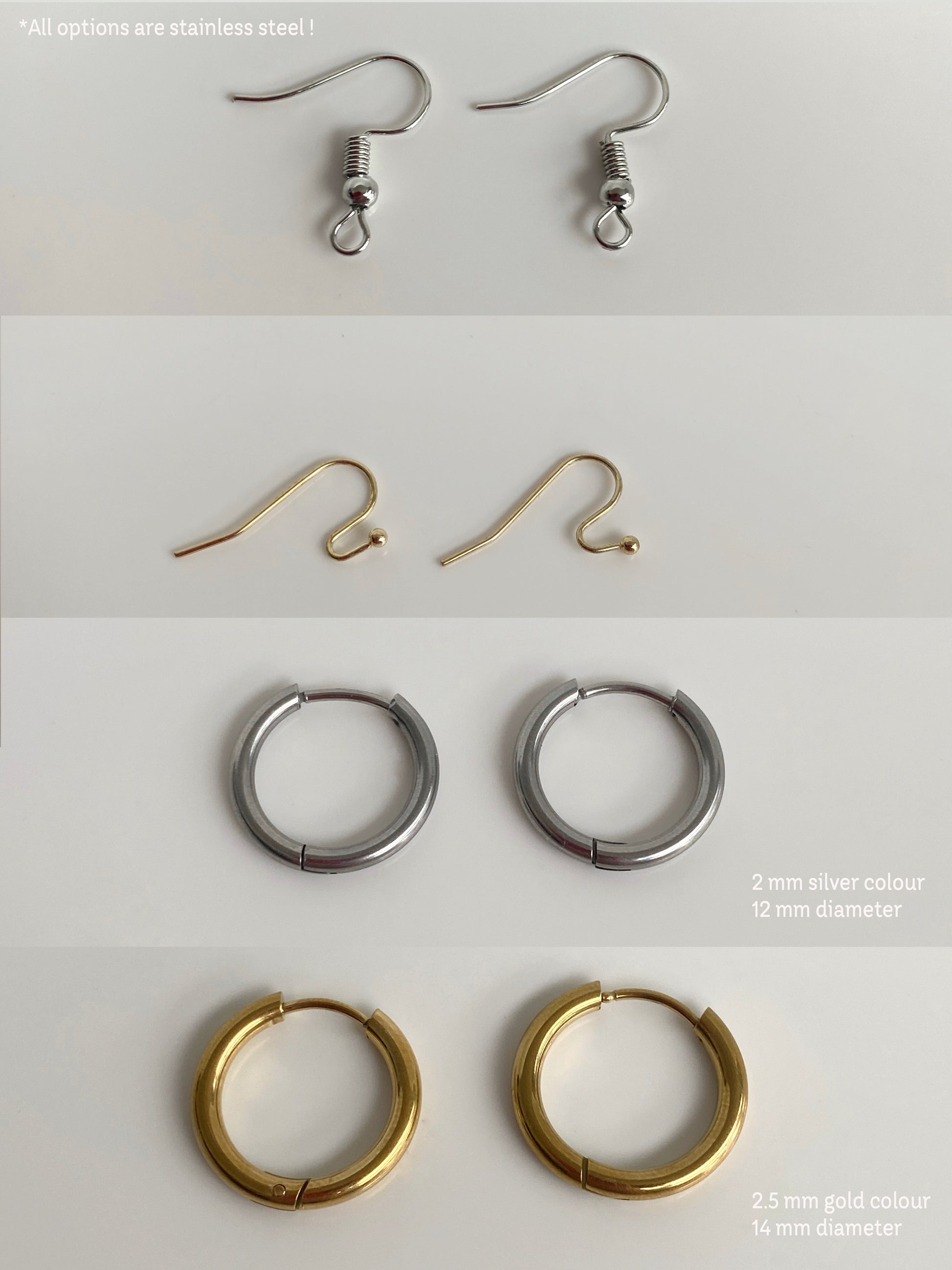 * Stainless steel hooks available in gold and in silver. Also possible to choose hoops (silver or gold).